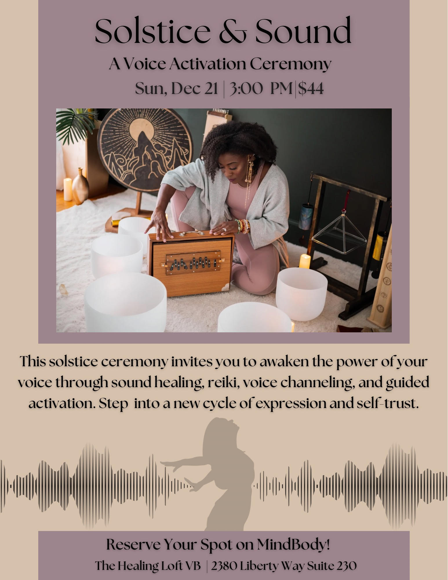 Join Tiffany Williams, owner of The Self Love Portal, for her 90 minute Solstice & Sound event. A sacred journey where stillness meets expression. This solstice ceremony invites you to awaken the power of your voice through sound healing, vocal reiki, and guided activation. Leave feeling grounded, clear, unmuted, and illuminated from within as you step into a new cycle of expression and self-trust.