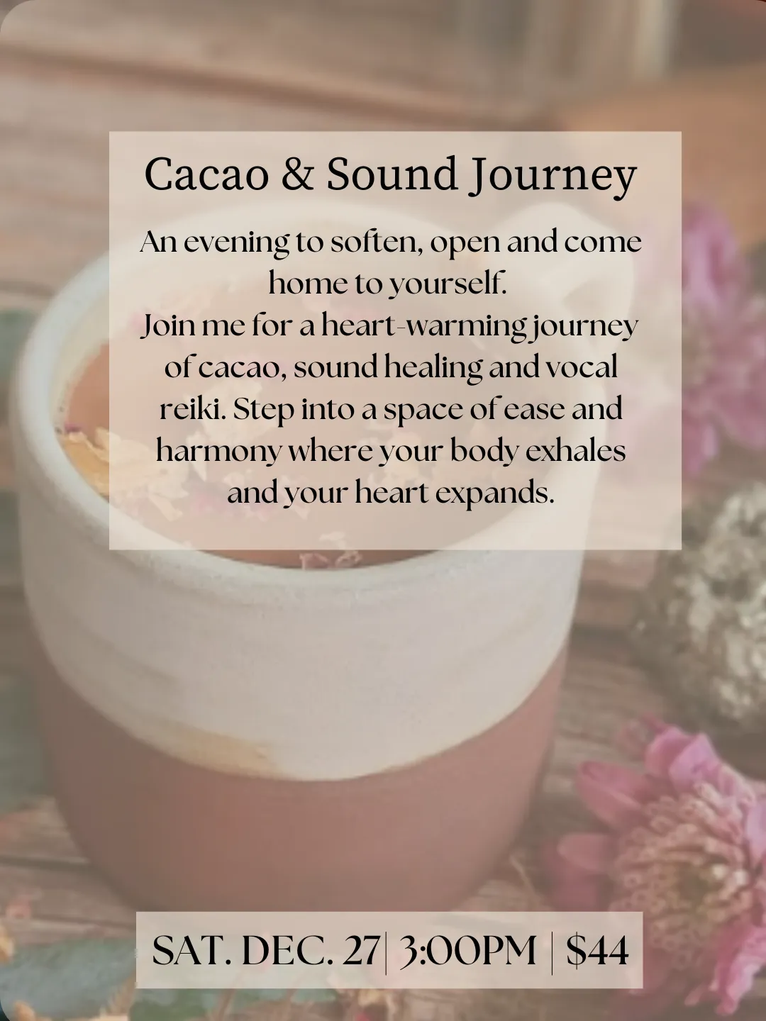 Join Tiffany, with The Self Love Portal, for this 90-minute heart-opening Sacred Cacao This is your invitation to slow down and honor yourself while enjoying this rich and powerful plant. In this space we'll tap into our own energy to amplify clarity, compassion and creativity. I'll guide you through meditation with sound immersion and vocal toning followed by an introduction to tools and practices to renew, cleanse and align to your divine wisdom. This transformative experience will help you cultivate your own awareness of self love into your daily life with intention, respect and reverence.