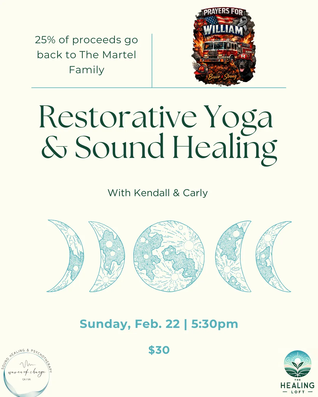 Join Kendall, owner of The Healing Loft, and Carly, owner of Waves of Change Coalition for an evening of restorative yoga and sound healing.