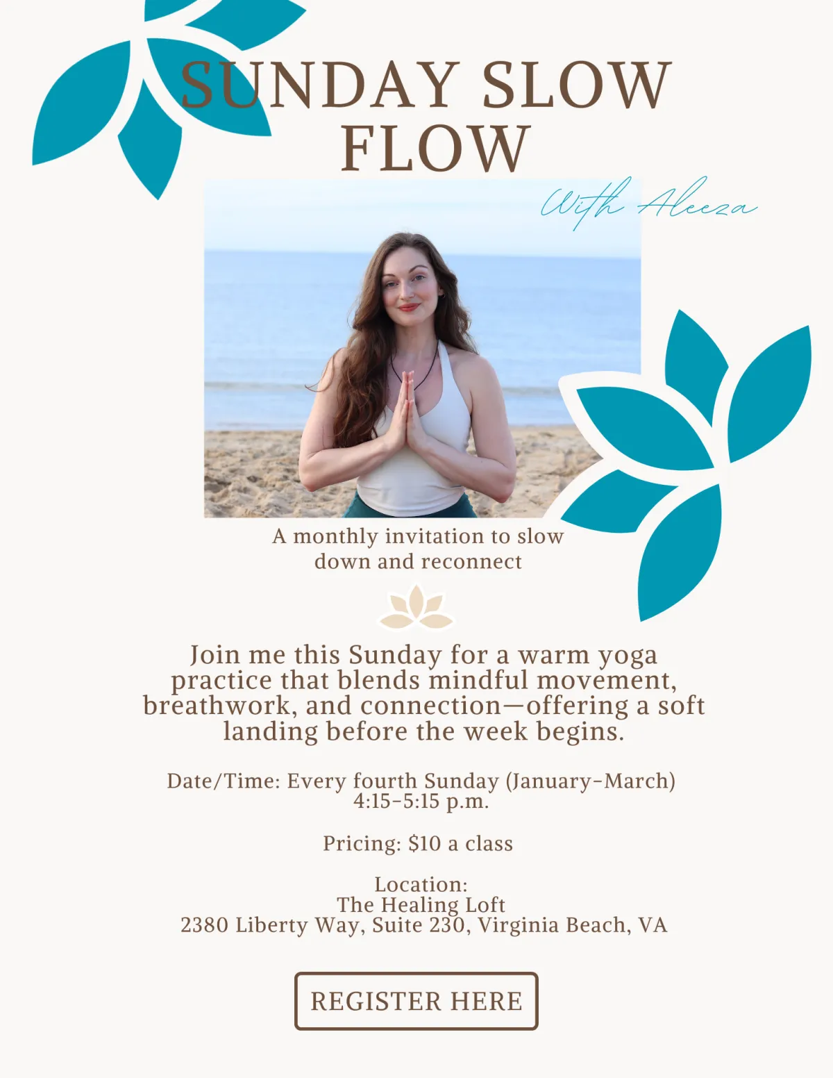 Join Aleeza for a warm yoga practice that blends mindful movement, breath work, and connection—offering a soft space to land before the week begins.