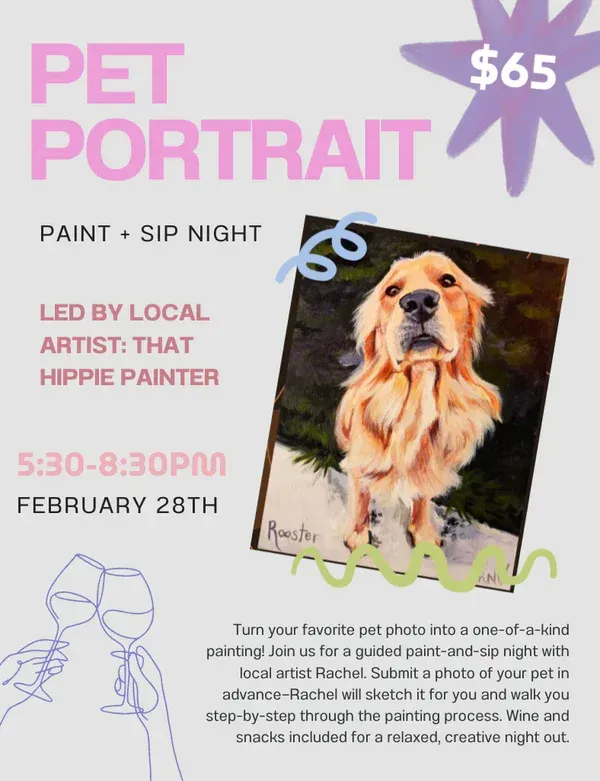 Turn your favorite pet photo into a one-of-a-kind painting! Join us for a guided paint-and-sip night with local artist Rachel (@thathippiepainter). Submit a photo of your pet in advance—Rachel will sketch it for you and walk you step-by-step through the painting process. Wine and snacks included for a relaxed, creative night out.