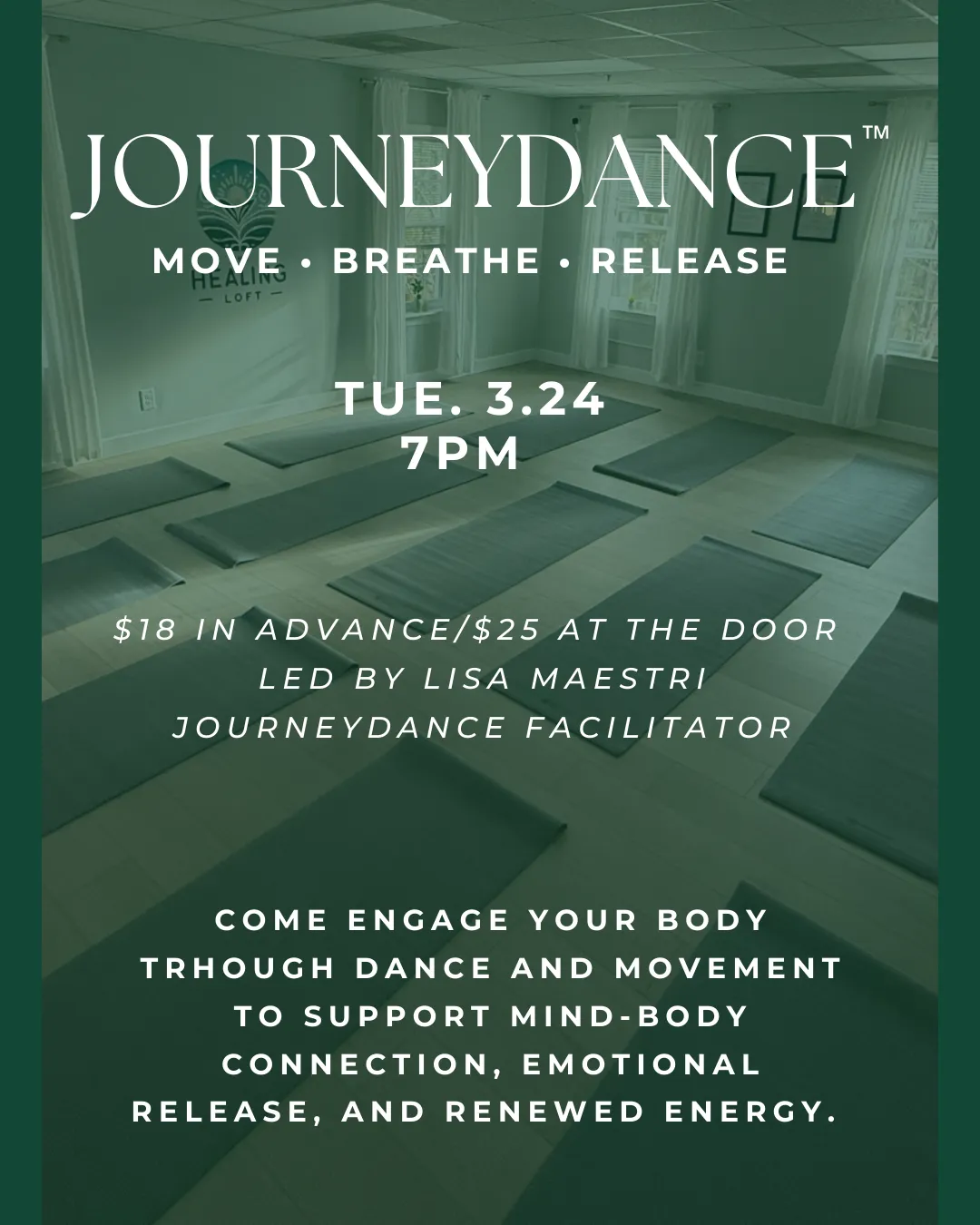 Join Lisa Maestri, for JourneyDance™! JourneyDance™ is an opportunity to get out of your head and back into your body. Through structured and unstructured movement, dancing and music journeydance provides the opportunity to reconnect with yourself. Come willing to have fun, engage with others. No dance experience is necessary. Come with an open mind, dressed in comfortable clothes and bring water.
